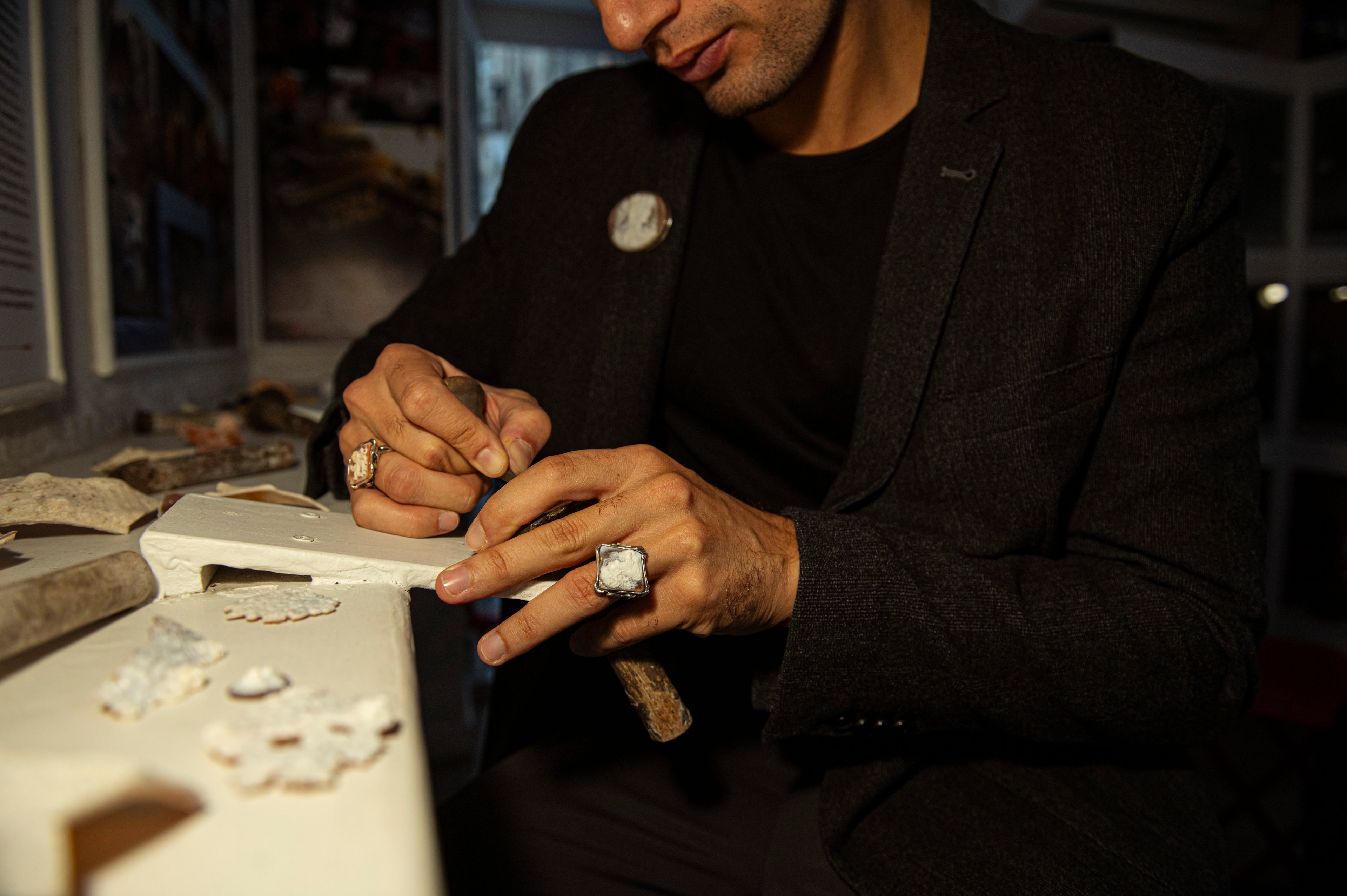 Il professore Vincenzo Nocereto, avendo lavorato con suo padre in modo coerente e giovanile nell'arte dell'incisione cameo, non solo ha maturato presto una profonda passione per questa arte, ma anche tecniche di lavorazione assimilate che ha meticolosamente sviluppato e perfezionato durante decenni di esperienza nel industria di cui può essere orgoglioso.